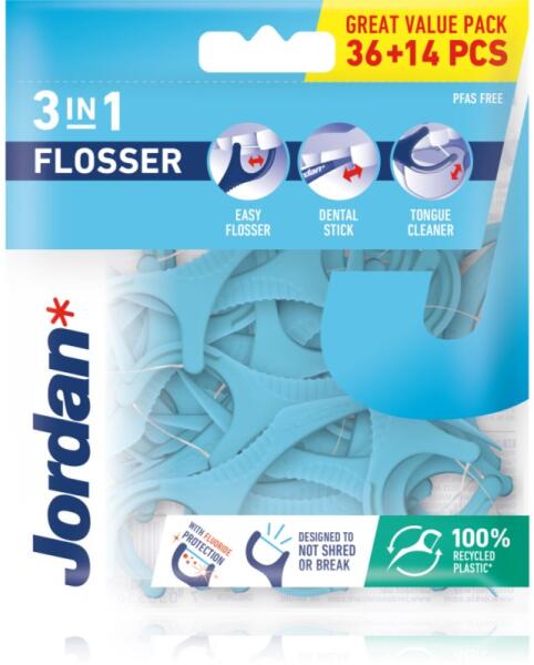 Jordan Flosser 3in1, 50 db, Fogselyem unisex, A minőségi Jordan Flosser 3in1 fogselyem a fogközök ápolásának egyik fontos kelléke. Olyan helyeken segíti a baktériumok elleni küzdelmet, ahová a fogkefe nem tud bejutni. Tulajdonságok: eltávolítja a fogíny vonala alatti foglepedéket előre levágott szálakkal garantáltan fogínykímélő eltávolítja az ételmaradványokat könnyen csúszik a fogak között Használata: Használja szokásos fogmosás után a fogközök utólagos tisztításához, illetve étkezés után a fogak közé ragadt ételmaradványok eltávolításához.